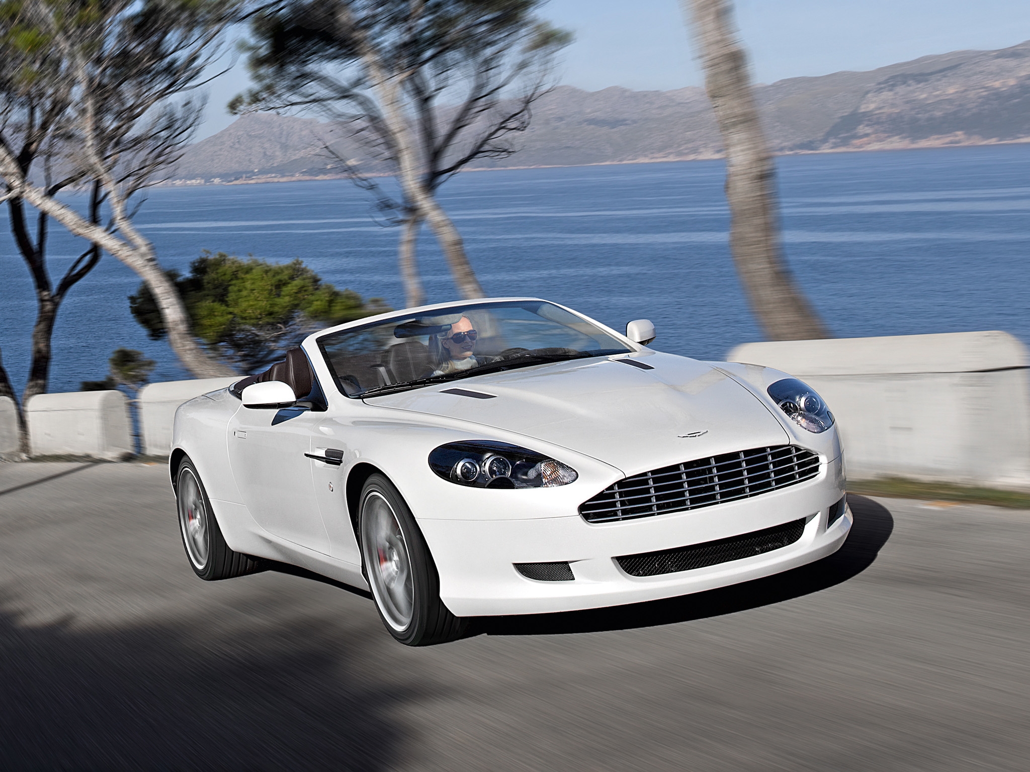 2008, Asphalt, Aston Martin, Cars, Db9, Front View, Mountains, Sea, Speed, Sports, Style, Trees, White Wallpaper